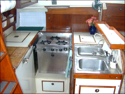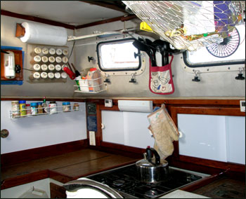 My galley on Hale Kai with spice racks, fan, opening ports. |