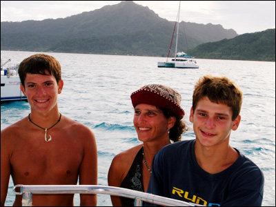 | Tania, Olivier, and the boys, in Tahiti, ready for the hand-off. |