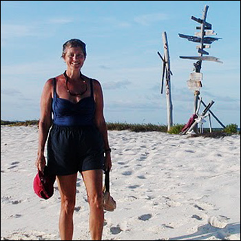 The segué via beautiful sunset into night's dark uncertainties is a tough transition time for many cruisers. Keeping herself busy is Teresa's solution. |