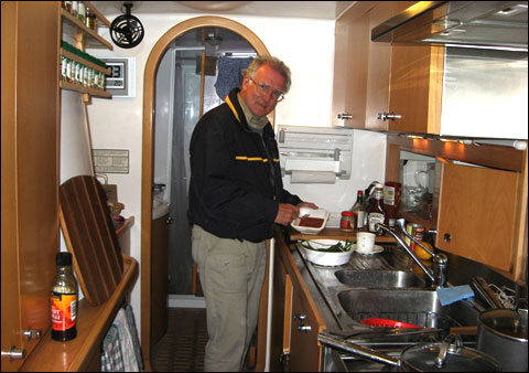The galley is 10 feet long and the aisle is narrow enough that I can securely brace myself wherever I am working and yet wide enough that, as my husband says, "2 people can ease past each other without first having to propose marriage."