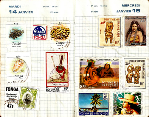 Friends, shells, photos, clothes, books, pareus and other charms, like Jamie’s parrotfish necklace given to him by the Kuna Indian Chief! We also enjoyed collecting coins and stamps from the countries we visited. Not only did they give us something to search out and learn about, but the collections became something sought after in every port we visited.