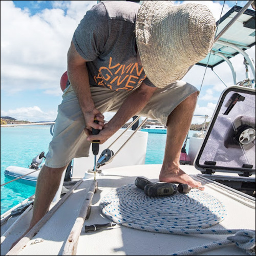 Eben chooses a boat project for the day, puts his swim shorts on and starts working.