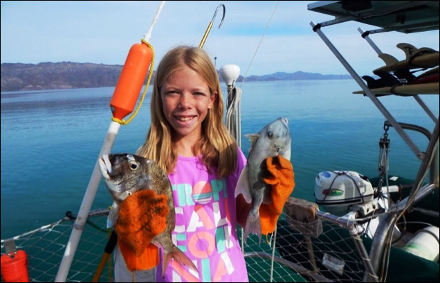 The girls love fishing from the boat and Phil spearfishes every day.